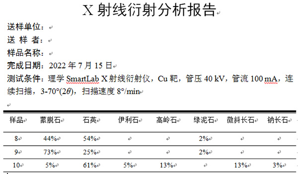 在很久以前,湖北宜昌鴉鵲嶺地區(qū)有一種土,粘度較大,吸水膨脹明顯。當(dāng)?shù)厝私羞@種土為兔兒泥。最近有相關(guān)單位在該地區(qū)的田畈村周圍采集了幾組土樣送到相關(guān)檢測機(jī)構(gòu)進(jìn)行了詳細(xì)成分化驗(yàn)。具體結(jié)果如下圖: